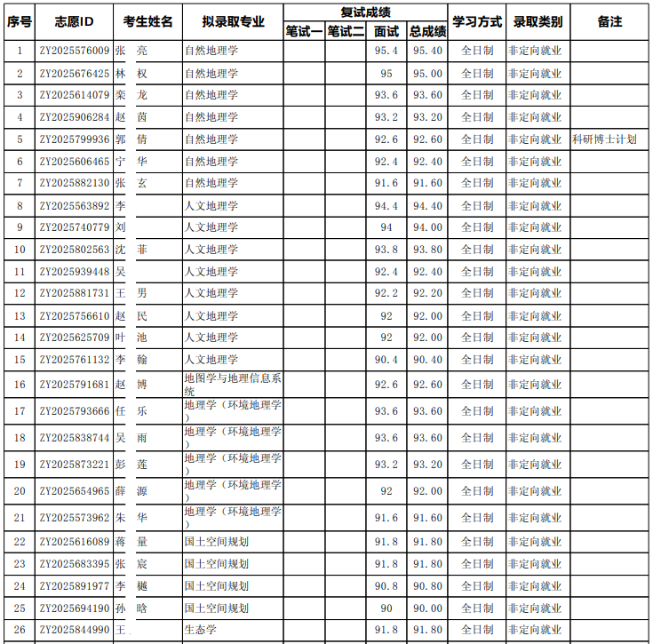 经北京大学研究生院审核批准,现公布城市与环境学院2026年博士研究生招生拟录取名单。
