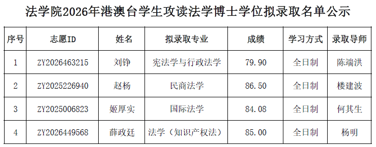 经北京大学研究生院审核批准,现公布我院2026年招收港澳台、留学生攻读法学博士学位拟录取名单。名单自即日起公示7日,如有异议,请在公示期内提出。