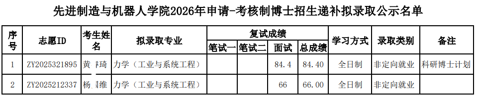 北京大学先进制造与机器人学院4月2日公示的2026年“申请-考核制”博士招生拟录取公示名单中,力学(工业与系统工程)考生肖亨波(志愿ID:ZY2025197599)、卢宇航(志愿ID:ZY2025329463)自愿放弃拟录取资格。根据该专业博士复试成绩排名顺序,现递补拟录取考生黄睿琦(志愿ID: ZY2025321895)、杨国维(志愿ID:ZY2025212337)。