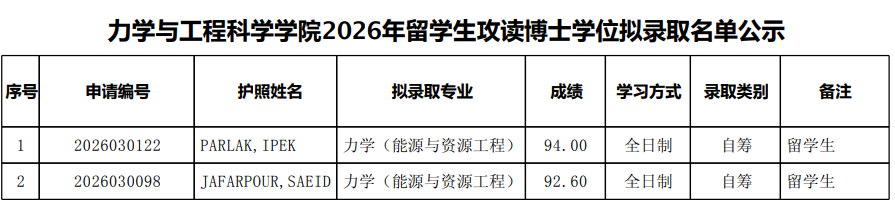 经北京大学研究生院审核批准,2026年北京大学力学与工程科学学院学术型博士招生拟录取名单(留学生),特此公示。