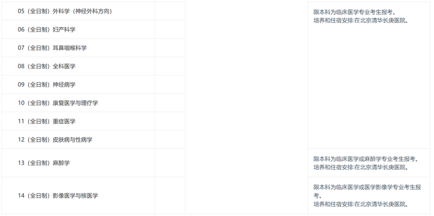 专业学位硕士细分更为全面,包括内科学、外科学、妇产科学、神经病学、麻醉学、影像医学与核医学等十余个临床亚专科方向,均标注为"限本科为临床医学专业考生报考"。