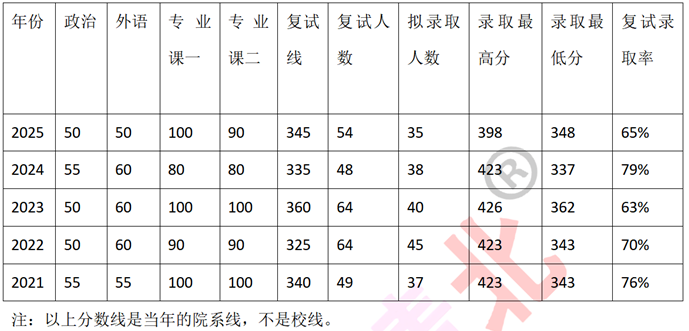 分数线趋势:复试总分线呈现一定波动,2023年达到近五年峰值360分,近两年虽有所回调(2025年为345分),但竞争压力始终存在。政治/外语单科线稳定在50分,而专业课单科线(100分/90分)在某些年份保持高位,这明确要求考生在备考中必须建立均衡、扎实的知识体系,杜绝任何明显短板。