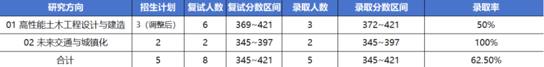 01方向复录比2:1,每2名复试考生中录取1人,竞争较为激烈。初试421分高分考生凭借稳定复试表现成功上岸,而部分低分考生未能录取。02方向等额复试,录取率100%,初试最低分345分压线录取。整体复录比62.5%,01方向复试筛选作用明显。清华土木水利01方向对考生综合素质要求较高;02方向看似温和,但需满足方向匹配且生源充足,明年是否仍为等额录取存在不确定性。