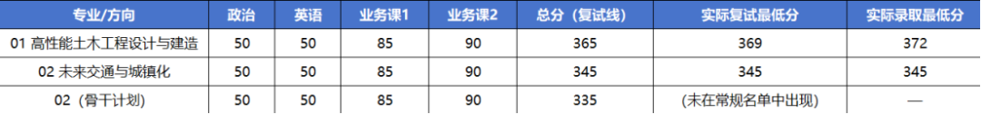 01方向复试线365分,但进入复试的实际最低分为369分。录取最低分372分,比复试线高出7分;而02方向复试线345分,压线即可录取。01方向有初试391分、381分、369分的考生未能录取,而372分成功上岸——复试准备还是很有作用的。