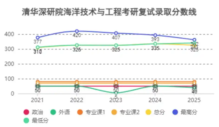 (2)5年中,海洋技术与工程方向一志愿复试最低分是310,最高分是335,也就是说我们努力考分在310-335之间是很有机会一志愿进复试的,录取最低分是321分,最高分是407分,也就是说我们努力考分在321-407之间是很有机会录取的。