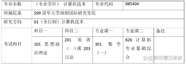 清华大学深圳国际研究生院计算机技术专业(专业代码085404)设有1个全日制研究方向,考试包含四个科目:101思想政治理论、201英语(一)或203日语、301数学(一)以及826计算机专业基础综合。
