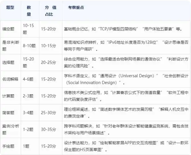 基础知识扎实性:填空题与判断题覆盖考纲中所有细分知识点,要求考生对《计算机网络基础及应用教程》《数字媒体艺术概论》等参考书目进行地毯式复习。