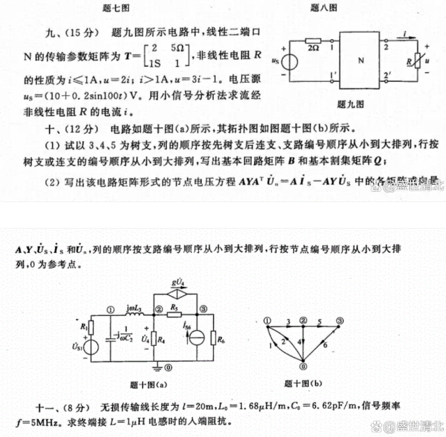 题九图所示电路中,给出了线性二端口的传输参数矩阵,非线性电阻的性质,以及电压源表达式。要求考生用小信号分析法求出流经非线性电阻的电流。这需要考生掌握二端口的传输参数,小信号分析法的原理和应用,通过具体电路进行分析计算。