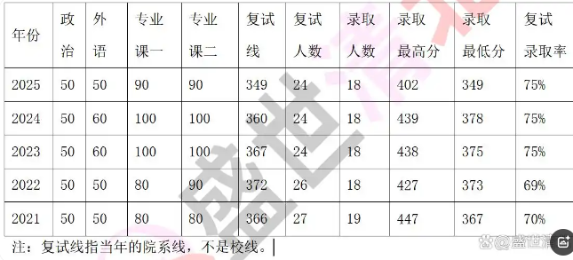 录取数据同样为我们提供了有价值的信息。2021年,复试27人,最终录取19人;2022年,复试26人,录取18人;从2023年至2025年,复试人数稳定在24人,录取人数也稳定在18人。录取最高分从2021年的447分逐步回落至2025年的402分,而录取最低分则从367分降至349分。这一变化反映出随着时间推移,考生整体分数水平有所波动,同时也意味着竞争的激烈程度依然不减。