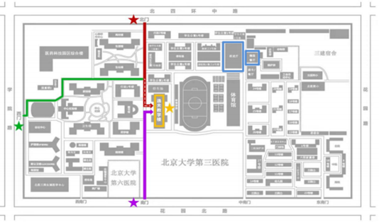 考生凭打印版准考证从北京大学医学部北门(位于北四环中路辅路南侧)、西门(位于学院路东侧)或南门(位于花园北路北侧)(见上图)进入校园。建议考生从北门或南门进入,北门、南门距逸夫教学楼的距离分别为300米、200米,预计步行时间4分钟左右。校门及逸夫楼将于 12 月 20日早 6:45、下午13:00 , 21日早 6:45 开启。请考生务必预留充足时间抵达考场。首场考试 8:10 宣读考场规则,8:30/14:00 开始考试。开考 15 分钟(即8:45/14:15)后,迟到考生不准进入考场参加当科考试。