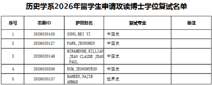 根据《北京大学2026年外国留学生研究生招生简章(校本部)》和《北京大学历史学系2026年博士研究生申请-考核制招生说明》的规定与要求,经过严格审核,决定同意以下留学生考生参加北京大学历史学系2026年硕士、博士研究生复试: