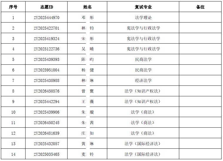 依《北京大学2026年面向香港、澳门、台湾地区招收硕士研究生、博士研究生招生简章》《北京大学2026年外国留学生研究生招生简章》及我院相关规定,我院对考生提交的申请材料进行了全面审核后,确定本通知名单中的考生可参加复试。法学院不再另行发放纸质复试通知书,请具备复试资格的考生按以下规定参加复试。