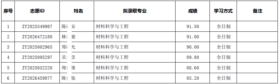 经北京大学研究生院审核通过,北京大学材料科学与工程学院2026年硕士拟录取名单,特此公示。