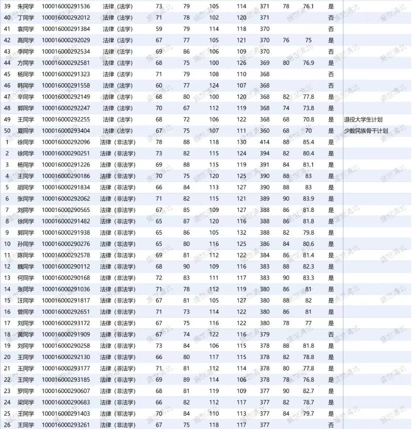 法律(法学):计划招生37人,复试50人,录取40人,录取最低分360分(少数民族骨干计划),普通考生录取最低分368分。