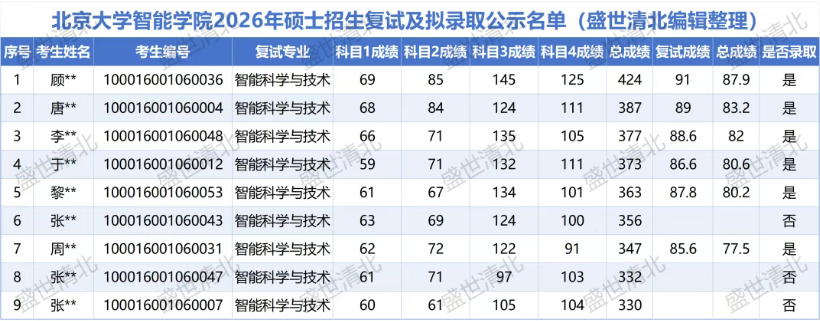 随着2026年硕士研究生招生工作接近尾声,北京大学智能学院近日公布了本年度硕士招生复试及拟录取名单。在智能科学与技术专业的激烈竞争中,424分学霸领跑、330分压线入围、347分考生成功逆袭、356分考生遗憾落榜等案例引发广泛关注。本文基于官方数据,对该专业的复试与录取情况进行结构化分析,供考生参考。