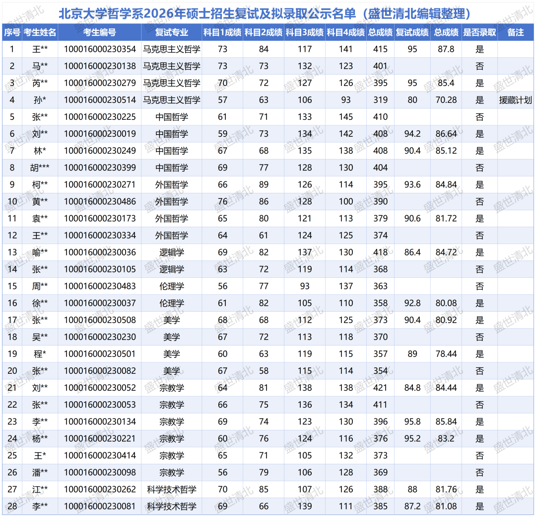 注:以上数据基于北京大学哲学系官方公布的复试通知及复试拟录取名单整   理,由盛世清北团队进行简要点评。如有疏漏,敬请指出,仅供参考。