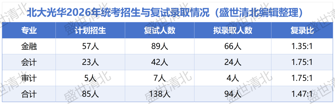 以上分析仅基于北京大学光华管理学院2026年的复试及录取数据,仅供参考。考研形势每年都在变化,招生计划、复试分数线、复录比等均可能发生较大波动。2027考生务必以当年官方发布的最新通知为准,不可盲目套用往年数据。
