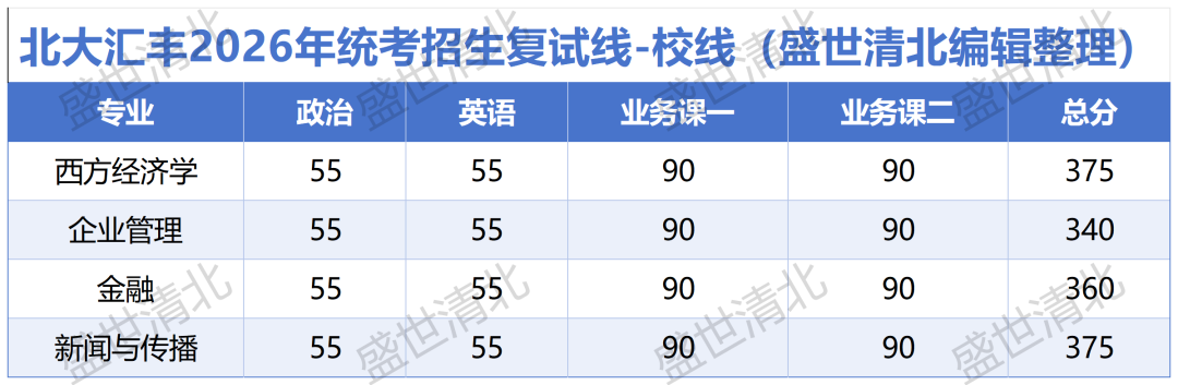 根据北京大学2026年硕士招生复试基本要求,汇丰商学院各专业复试分数线校线如下: