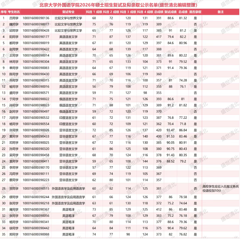 北京大学外国语学院2026年硕士招生拟录取名单近日公布。与多数院系不同,外院学术型专业及英语笔译专业复试权重仅30%,初试成绩占比高达70%。然而,在初试主导的规则下,依然出现了355分压线逆袭、低分考生成功上岸的经典案例。