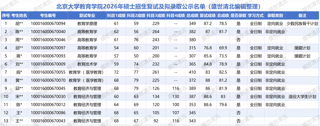 北京大学教育学院2026年硕士招生复试及拟录取名单已公布。教育学原理专业349分(少干计划)、高等教育学援藏计划307分和315分成功上岸,教育经济与管理专业343分考生遗憾落榜,353分考生压线录取。初试与复试各占50%的权重下,复试表现成为决定成败的关键。