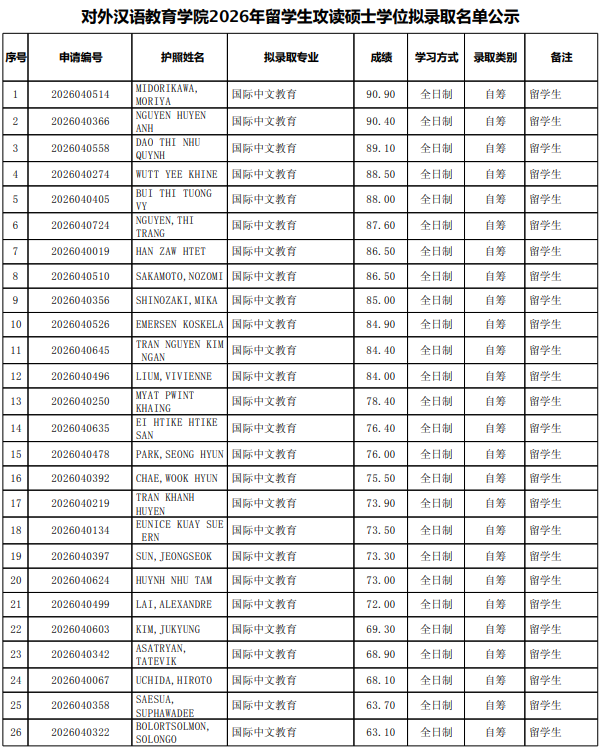 综合笔试面试情况,经北京大学研究生院审核,对外汉语教育学院2026年国际中文教育专业第一批次留学生硕士招生拟录取名单如下。