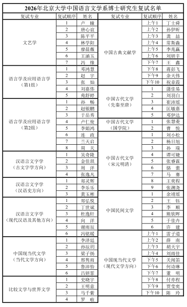 北京大学中文系2026年博士研究生复试全部采取线下面试的形式,具体安排如下: