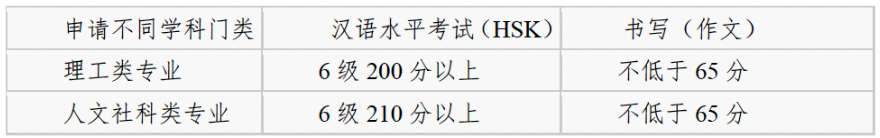 (1) 申请采用汉语授课的学科门类,应提交达到以下标准的成绩单或其它相关汉语水平证明文件。