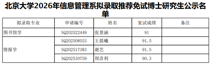以上是关于【2026年北大信息管理系博士招生拟录取公示名单】的内容,希望能帮助准备考研清北的同学们节约时间,提高上岸的成功率。