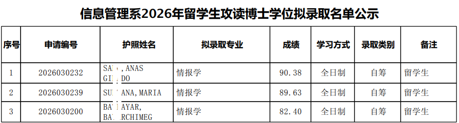 经北京大学研究生院审批,信息管理系公示2026年博士招生拟录取名单,名单自即日起公示7日,如有异议,请将问题实名发送至:gxgzs@pku.edu.cn。