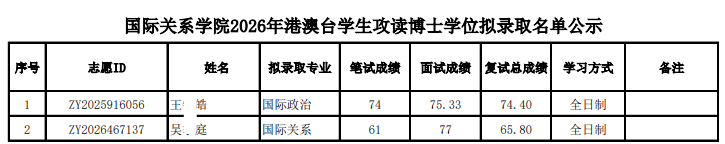 以上是关于【2026年北大国际关系学院港澳台学生攻读博士学位拟录取名单公示】的内容,希望能帮助准备考研清北的同学们节约时间,提高上岸的成功率。