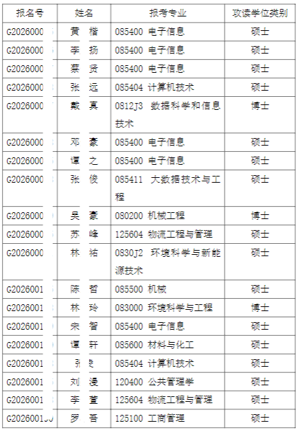清华大学深圳国际研究生院2026年招收港澳台地区研究生入围综合考核的名单已确定,现公布如下: