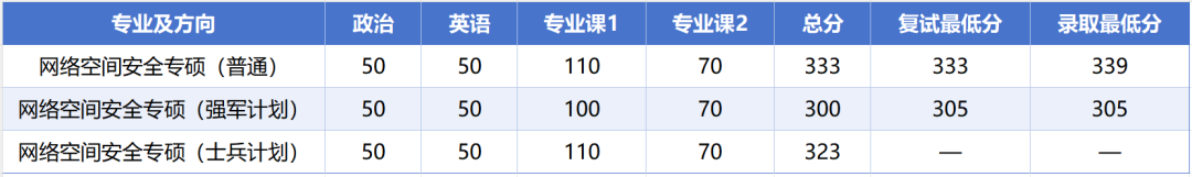 普通考生复试线333分,单科要求专业课1达到110分,反映出对数学或专业基础能力的高度重视。实际录取中,普通方向录取最低分为339分,333分压线入围考生未能录取。这说明进入复试只是第一步,复试表现才是决定最终结果的关键。强军计划考生305分录取,体现了不同专项计划的录取标准有所差异。
