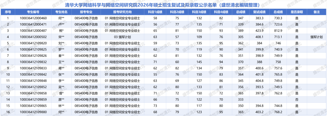 备注说明: 以上数据源自清华大学网络科学与网络空间研究院官网公布的2026年硕士招生复试分数线及拟录取名单,由盛世清北编辑整理。如有疏漏,欢迎指正。