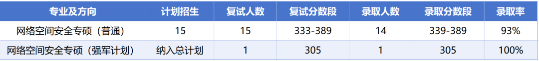 2026年网络空间安全专硕原计划招生12人,复试通知中招生计划调整为15人。复试人数与招生计划基本相当,录取率约93%。但需要注意的是,入围不等于录取,复试环节仍然发挥着筛选作用。