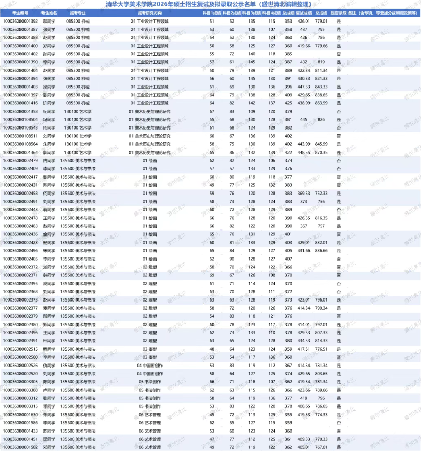说明: 以上数据源自清华大学美术学院官网公布的2026年硕士招生复试分数线及拟录取名单,由盛世清北编辑整理。如有疏漏,欢迎指正。
