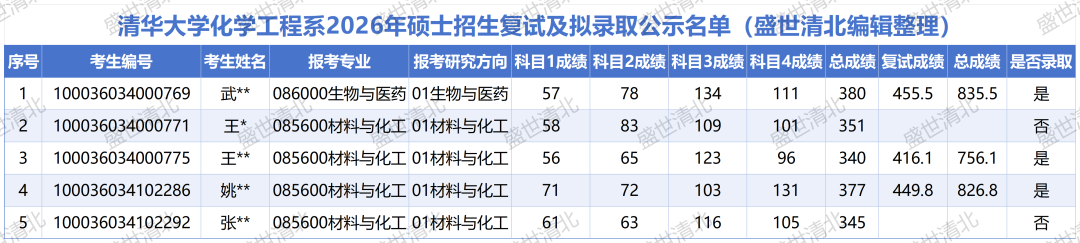备注说明: 以上数据源自清华大学化学工程系官网公布的2026年硕士招生复试分数线及拟录取名单,由盛世清北编辑整理。如有疏漏,欢迎指正。