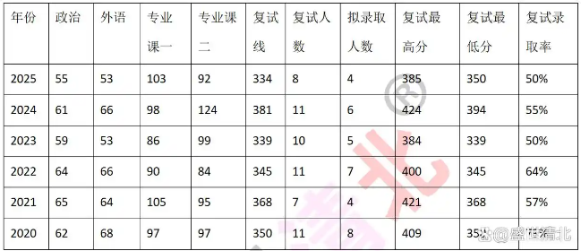 总分数线同样存在明显波动。2020 年复试线为 350 分,2021 年上升至 368 分,2022 年降至 345 分,2023 年为 339 分,2024 年达到近六年最高 381 分,2025 年又回落至 334 分。其中,2024 年分数线的大幅上涨,意味着考题的难度可能有所增加,对考生的知识掌握程度和综合运用能力提出了更高的要求。
