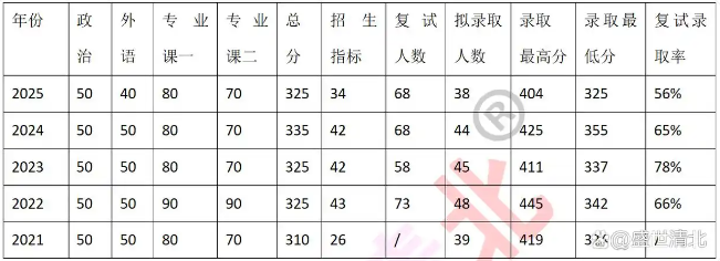拟录取人数:2021年39人,2022年48人,2023年45人,2024年44人,2025年38人,呈现“缓慢缩减”态势。盛世清北提醒,考生需关注院校官网发布的“推免生占比”,若推免名额增加,统考招生规模将进一步压缩。