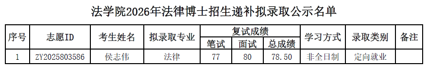 北京大学法学院3月18日公示的2026年法律博士招生拟录取名单中,考生贾雯(志愿ID:ZY2025024008)自愿放弃拟录取资格。根据博士招生成绩排名顺序,现递补拟录取考生侯志伟(志愿ID:ZY2025803586)。