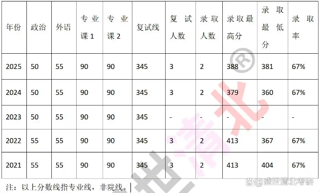 在招生规模上,该专业体现了典型的“精英化”培养模式。近五年来,年度录取人数基本稳定在2人(2021-2022年,2024-2025年),可见统考名额极为稀缺。相应的复试录取率也稳定在67% 左右,即每3位进入复试的考生中约有2人被录取。这明确提示考生,复试环节至关重要,即便初试分数领先,也绝不能掉以轻心。