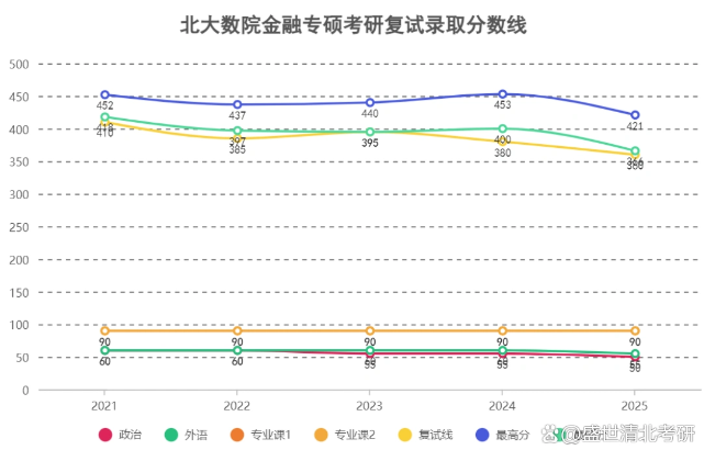 从近五年的数据可以清晰地看出,各科目分数线整体趋于平稳状态。政治和外语分数线虽有小幅波动,但整体变化不大;专业课 1 和专业课 2 的单科分数线更是始终稳定在 90 分。然而,这并不意味着考试难度降低。北大数院金融专业向来是众多优秀学子竞相角逐的热门领域,复试中高分频现,竞争异常激烈,堪称“神仙打架”。因此,考生们必须高度重视专业课的复习,尽早开启备考之路,制定科学合理的复习计划,少走弯路,从而在复试中占据优势。