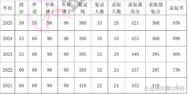 复试的最低分在 360 分(2025 年),最高分达到 410 分(2021 年)。这意味着考生若想有机会进入复试,应努力将总分考在 387 - 453 分这个区间。而录取的最低分是 366 分(2025 年),最高分 453 分(2024 年),所以考生若想增加被录取的几率,应努力将总分考在 366 - 453 分之间。当然,分数越高,录取的把握也就越大。